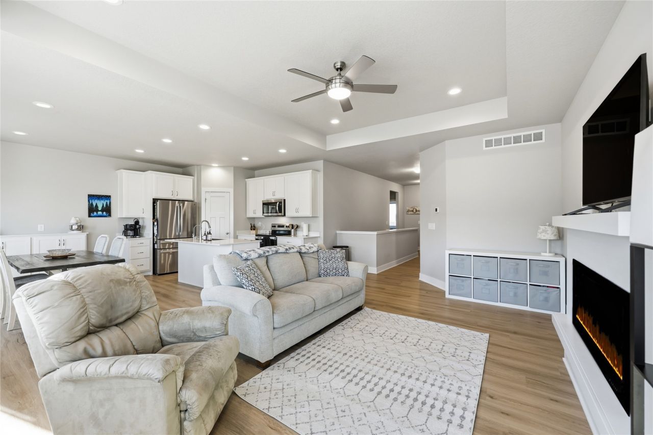 Better than new construction, this 1.5 year old home comes with all the benefits of new construction PLUS a fenced in yard, built in buffet in the dining area, blinds on the windows, a water filtration system, and a water softener. This 4 bed, 3 bath ranch home has a finished lower level and daylight windows. The main level has 9 foot ceilings, LVP throughout the main living areas, tray ceilings in the great room and primary bedroom, kitchen island, pantry, electric fireplace, and plenty of space for a dining table and entertaining room. This home also has plenty of natural light with big windows off the great room. The primary bath has a tiled shower and dual vanities. The unfinished area in the lower level has so much storage space for future finish or storing all your awesome stuff. Going outside you will enjoy a newly stained deck and fenced in backyard! This home has a great location-Close to Costco and just minutes to I35. All information obtained from seller and public record.